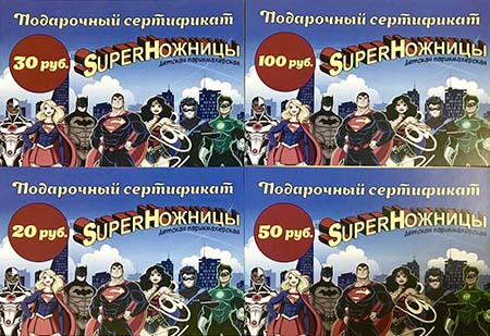У нас можно приобрести подарочные сертификаты для родных и близких. Сертификат действует не только на стрижки, но так же на все услуги нашей парикмахерской SuperНожницы
